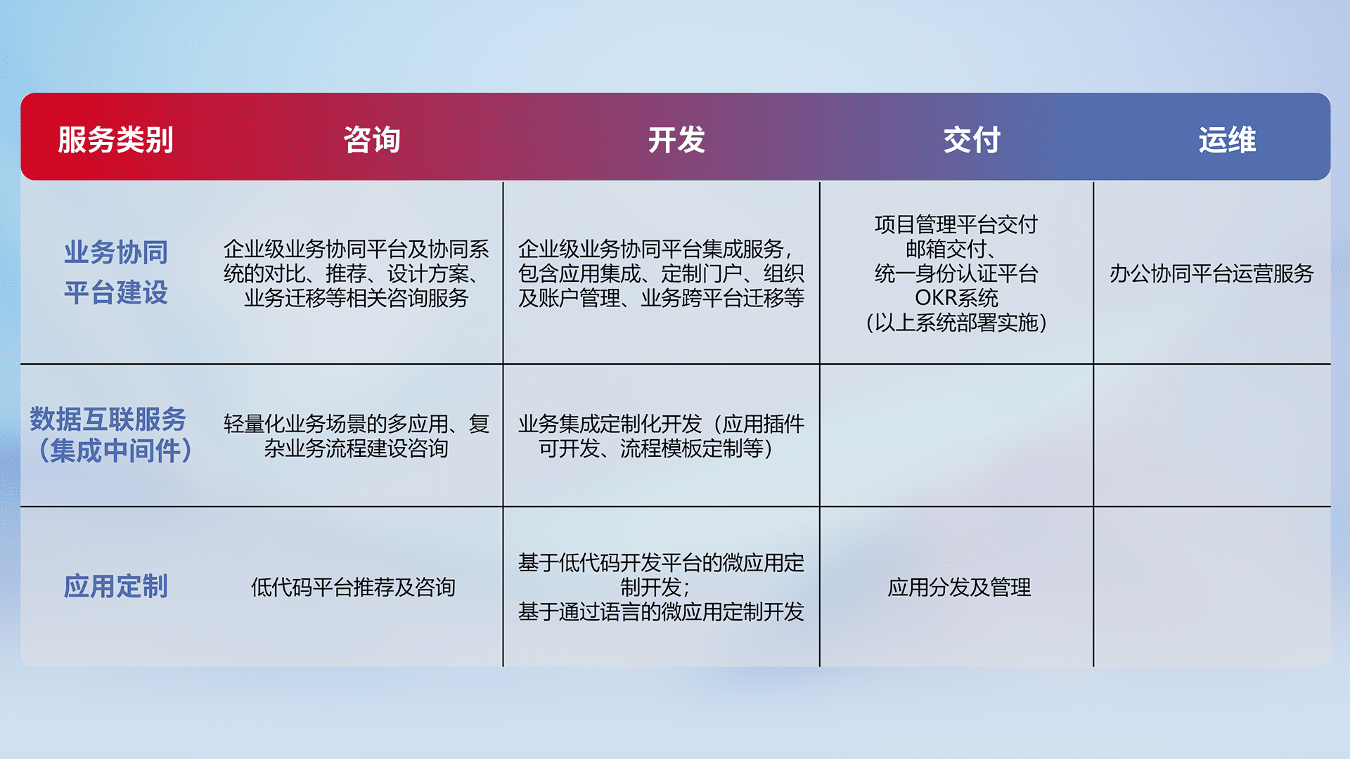 针对钉钉、、企微、、、、IDaas等平台级产品提供产品的规划、、、方案、、、交付、、、、定制化开发等服务,,,实现如统一协同办公、、、、智能客户服务、、、、混合会议管理、、、、智能数据查询、、、、等业务场景,,实现数字化转型。。