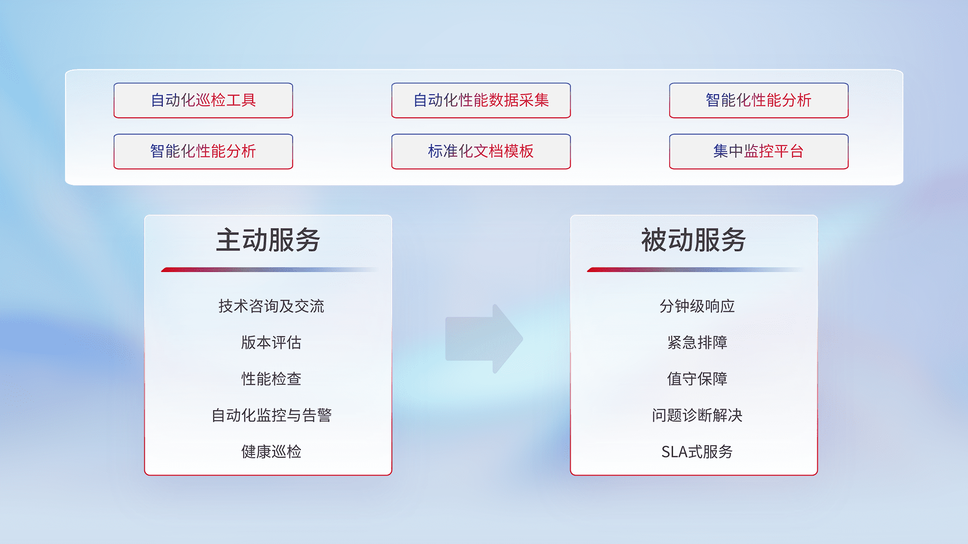 智能化工具和标准化文档,,保障服务质量,,提供主动服务(包含技术咨询、、、、版本评估、、、、性能检查、、、、自动化监控与告警、、健康巡检)和被动服务包含(分钟级响应、、、、紧急排障、、、、值守保障、、问题诊断解决、、、、SLA服务)。。