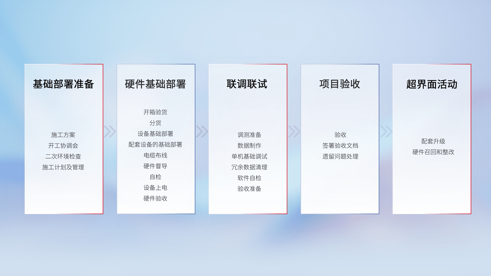 从基础部署准备、、、硬件基础部署、、、联调联试、、项目验收、、、、越界面活动的全过程可追溯,,保证施工质量和进度。。。